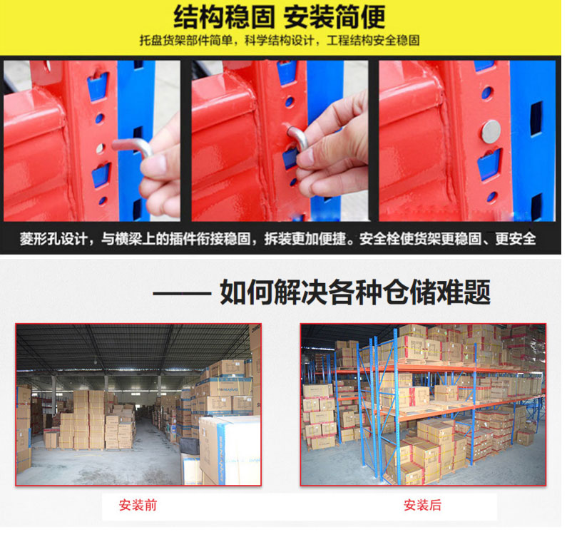 通廊式货架又称贯通式货架、驶入式货架;叉车可直接进入货道内存储货物;适合批量大、品种少的货物存储,储存密度大;采用不同的设计方式(货架末端有无支撑杆封闭),可实现货物先进后出和先进先出的管理。重型横梁货架属于定制货架,根据不同的场地,有不同的设计方案,我们可以免费上门为您设计,并提供方案设计图以及报价;